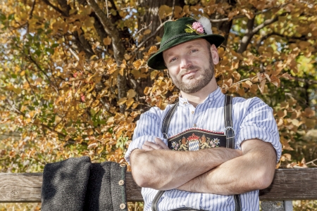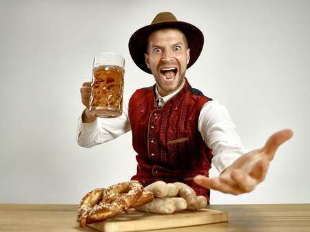 Germany, Bavaria, Upper Bavaria. The young happy smiling man with beer dressed in traditional Austrian or Bavarian costume holding mug of beer at pub or studio. The celebration, oktoberfest, festival concept