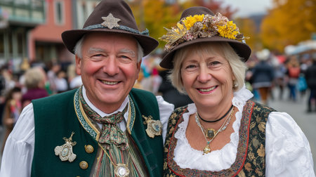 Two smiling seniors wear colorful traditional outfits, enjoying a lively community celebration.