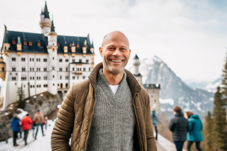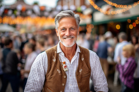 Portrait of a handsome senior man in traditional Bavarian clothes smiling at the camera while standing in front of a market stall.