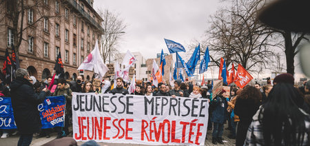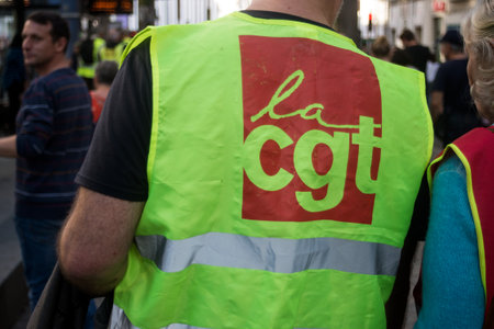 Mulhouse - France - 18 October 2022 - Portrait on back view of people protesting in thee street with CGT syndicate jacket