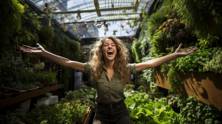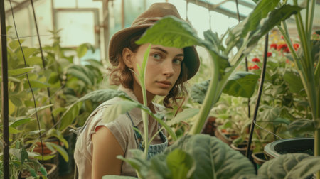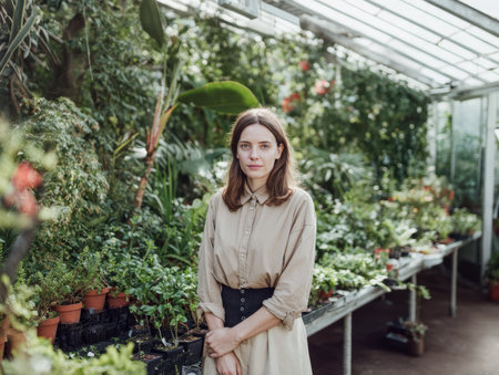A confident woman standing in a beautiful greenhouse surrounded by lush greenery and vibrant flowers.