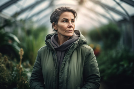 Portrait of mature female gardener standing in greenhouse and looking away