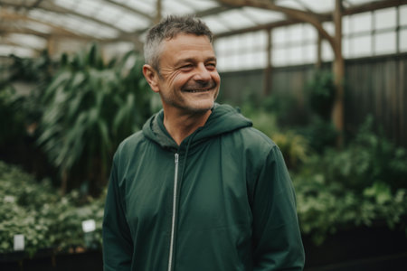 Portrait of a smiling middle-aged man in a greenhouse.