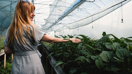 A woman walks inside a greenhouse of a plant nursery and touches the beautiful juicy foliage of perennial plant seedlings