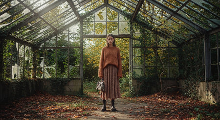 Red-haired girl in a long coat in an old greenhouse.