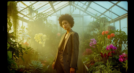 A woman with afro-textured hair stands in a lush greenhouse surrounded by vibrant flowers and plants