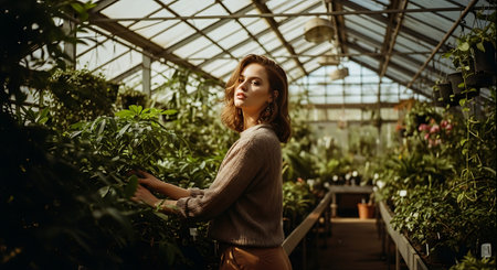 A woman stands inside a greenhouse filled with various plants and flower pots. Sunlight comes through the glass walls, highlighting the plants around her.