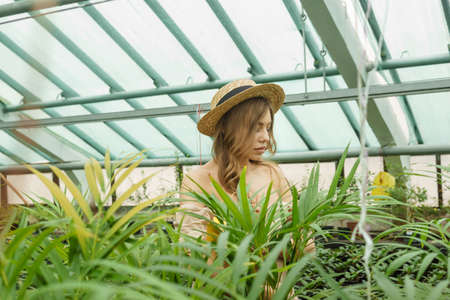 A beautiful young woman takes care of plants in a greenhouse. The concept of gardening and an eco-friendly lifestyle.