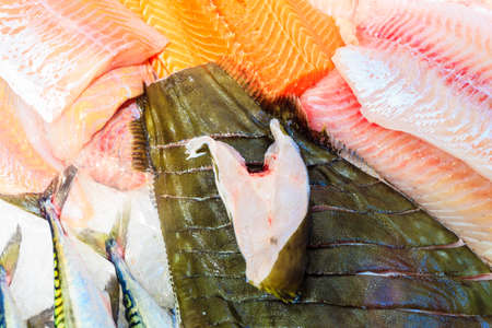 Healthy food nutrition. Various fishes in at famous fish market (Fisketorget) in Bergen, Norway