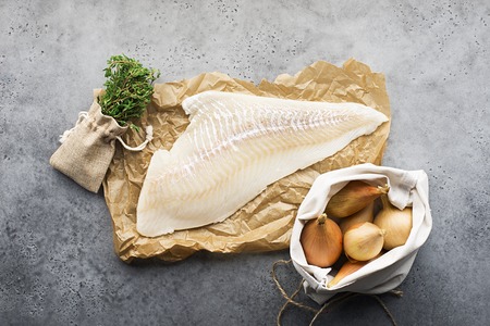 Zero waste kitchen. Ingredients of healthy nutrition. White sea fish cod fillet, shallot onions, lemons, greens. Top view
