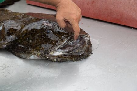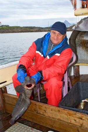 Fisherman with big wolffish near Lofoten, Senija, Alta Norway. Man holding catch Atlantic wolf fish