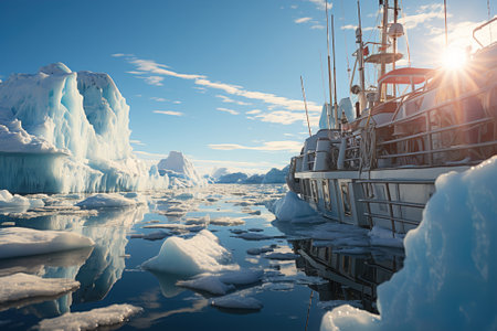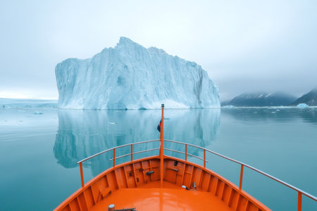Orange ship sailing towards a massive iceberg in the arctic ocean, creating a captivating polar exploration scene