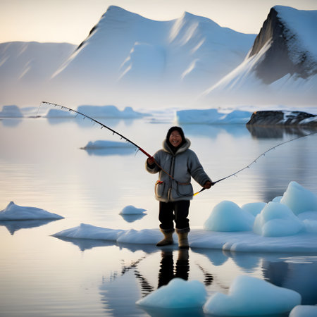 Eskimo man sits in the Arctic and fishes fish from an ice hole