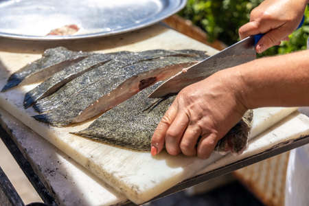 The cook cutting the fish to be barbecued in Portuguese restaurant