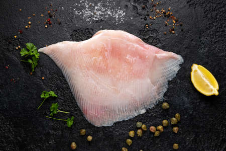 Raw halibut set, with ingredients and rosemary herbs, on black dark stone table background, with copy space for text