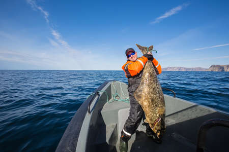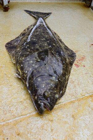Alive Flatfish Pacific halibut (Hippoglossus stenolepis) on the boat deck.