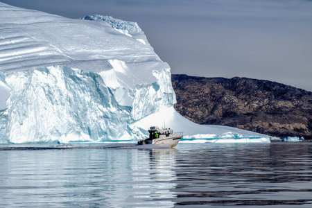 Expedition boat in the Disko bay nearby of Ilulissat, Greenland. Site is the favourite destination for whale watching and Iceberg exploration.