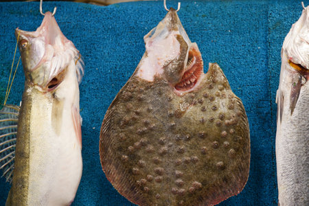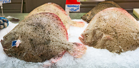 Stack of fresh brill fish (Scophthalmus rhombus) is a species of flatfish, sold it at matket, seafood.