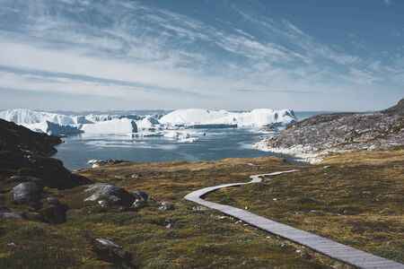 View towards Icefjord in Ilulissat. Easy hiking route to the famous Kangia glacier near Ilulissat in Greenland. The Ilulissat Icefjord seen from the viewpoint. Ilulissat Icefjord was declared a UNESCO World Heritage Site in 2004