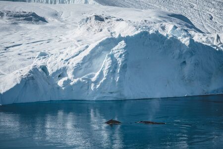 Bright sunny day in Antarctica. Full calm and reflection of icebergs in deep clear water. Travel by the ship among ices. Snow and ices of the Antarctic islands. Photo taken in Greenland.