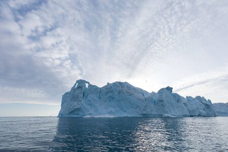 Arctic nature landscape with icebergs in Greenland icefjord with midnight sun sunset sunrise in the horizon. Early morning summer alpenglow during midnight season. Ilulissat, West Greenland. Photo taken in Greenlannd.