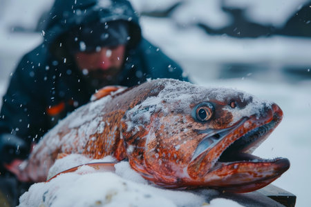 A joyful fisherman showcases his fresh catch of crab in a stunning winter landscape, blending the beauty of nature with the excitement of fishing adventures.