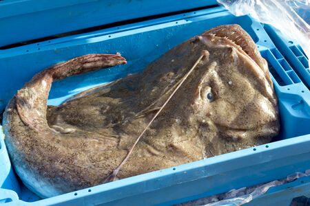 Monkfish newly fished and stored in boxes with ice at port of Palamós in the Costa Brava, Catalonia Spain