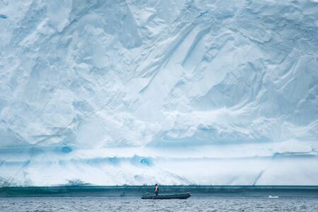 Man on a small rubber boat next to iceberg floating in the ocean. Antarctic Peninsula