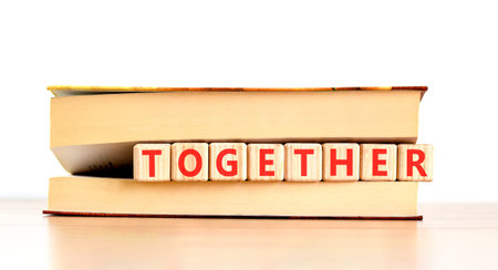 Together word symbol. Concept word Together on beautiful wooden blocks in beautiful book. Beautiful wooden table white background. Business support help together word concept. Copy space.