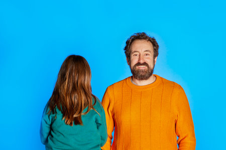 Funny dad with child daughter teen girl with isolated on blue background studio portrait. She does not want photos, no face child. Family day parenthood childhood concept