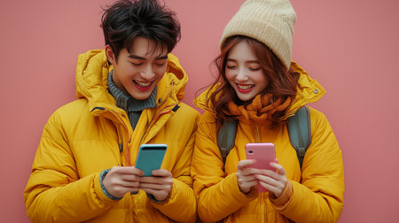 happy young asian couple in winter jackets using smartphones isolated on pink