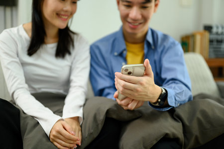 joyful young couple engaged in playful smartphone interaction while sitting comfortably on a stylish couch in a cozy living room filled with modern decor and personal touches capturing their delightful moments together
