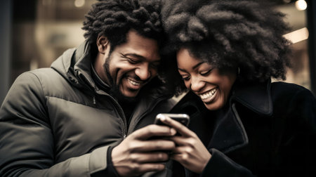 Happy african american couple using mobile phone in the city. Smiling man and woman looking at smartphone screen.