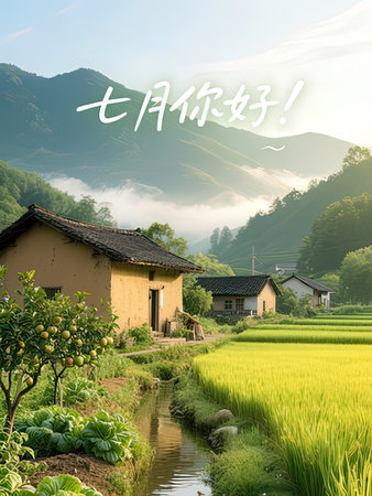 \Chinese village in the middle of a rice field with text \\I am happy\\\