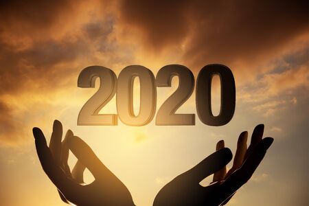 2020 new year concept with silhouette hands against sunset.