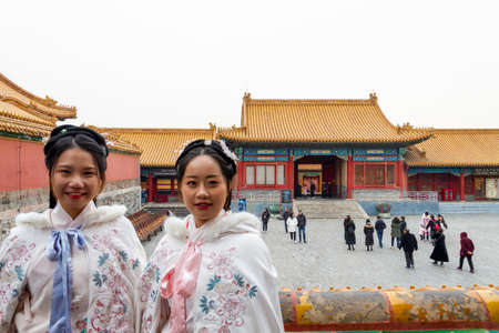Beijing, China - November 21 2019: Two young Chinese women pose dressed in traditional Chinese clothes in the Forbidden City in Beijing China