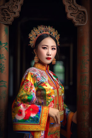 An AI generated illustration of a beautiful Chinese woman wearing vibrant traditional costume