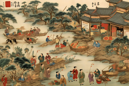 Historic march in traditional Asian village at sunset with diverse individuals. That the image is generated using AI.