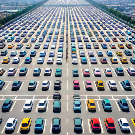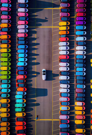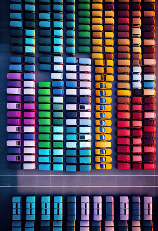 Aerial shot of a parking lot filled with an array of brightly colored cars, illustrating a busy, modern urban environment.