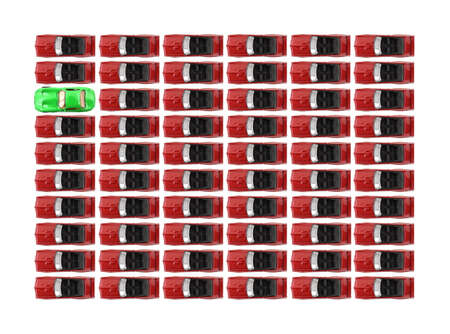 A large group of red convertible toy cars going in one direction with a green coupe as the odd vehicle out.