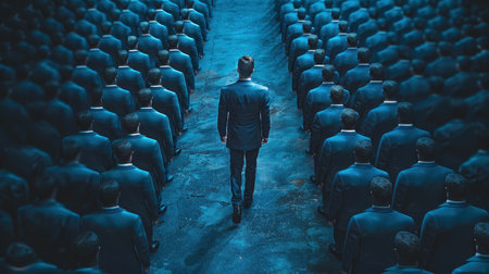 Lone Rebel - A portrait of a solitary figure highlighted amongst a sea of faces, capturing the essence of rebellion and nonconformity in youth culture.
