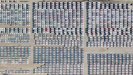 Aerial shot of parked cars in a structured row parking lease cars new production industry