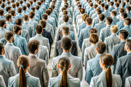 Many similar people lined up in rows reaching to the horizon.