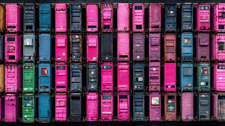 Aerial shot featuring a diverse array of shipping containers in vibrant colors, showcasing the dynamics of urban logistics and contemporary industrial design in a striking visual pattern.