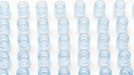 Multiple clear plastic cups are neatly arranged in a grid formation on a bright white background, offering a modern and minimalist visual ideal for various design projects.