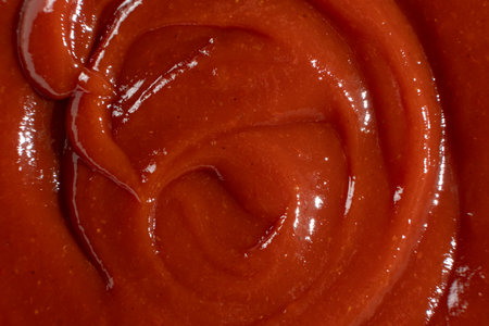 Macro texture of ketchup, natural traditional tomato sauce, top view, culinary background