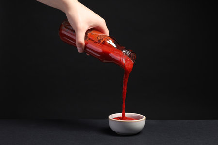 Woman pouring tasty ketchup from bottle into bowl against black background, closeup