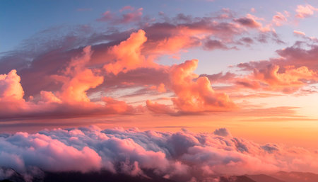 Experience the breathtaking beauty of a sunset illuminating fluffy clouds in the sky, casting soft colors and creating a serene atmosphere reminiscent of nature's calm.