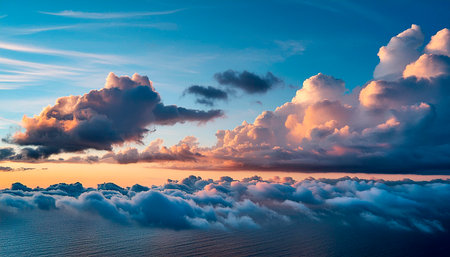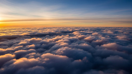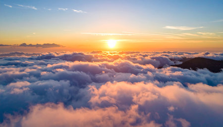 Beautiful aerial view above clouds at sunset. Panoramic view