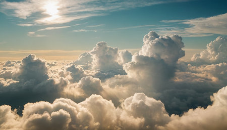 Aerial view of beautiful cloudscape with blue sky and sun.